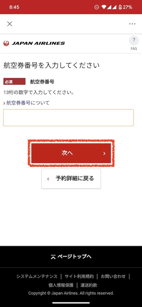 - 航空券番号を入力して「次へ」ボタンをタップします